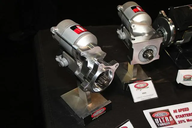 Powermaster's 9532 starter for Coyote Mustangs (foreground) and 9509 for LS engines share the same guts, but differ in their mounting configurations. Both will spin engines running up to 18:1 compression ratio.