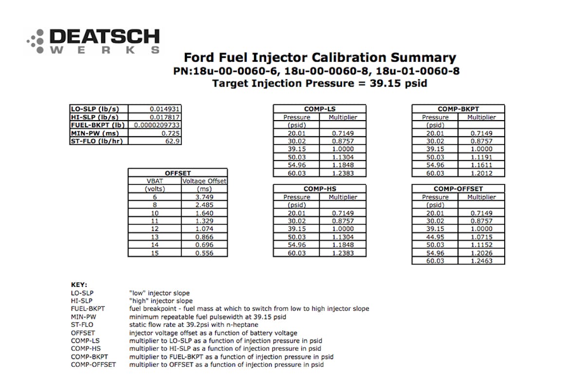 Any tuner will tell you that the more data they have on the parts in a particular setup, the better than can tune a car. Deatschwerks spent about a year developing and verifying injector calibration summaries for their entire modern muscle car product line. “When you purchase a set of our injectors, what comes with them–which, in many cases, tuners find more valuable–is the tuning data,” says Deatsch.