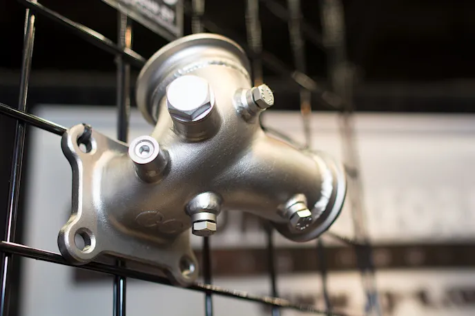 cp-e was also showing off their new forged rods and pistons, which are being produced by Manley, and will be available through cp-e soon. The prototypes for those parts were installed on the display engine at the show, and there were a few available for viewing as well.cp-e developed a special manifold for the ST, all EcoBoost four-cylinders, use an integrated manifold design on the cylinder head, the exhaust merge is built to the cylinder head, and fed to the turbo. There is a bolt on flange, that acts as a manifold to the turbo. cp-e’s version is made from 304 cast stainless steel. It features and oversized opening on the cylinder head side, so that if owners decide to have some cylinder head porting done to increase exhaust flow, the part should match.