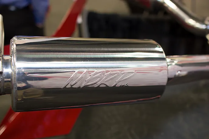 The mufflers are a hybrid design, according to MBRP’s Jesse Rohr. They’re a chambered design with a perforated core. The race versions are somewhat smaller, and louder according to Rohr.