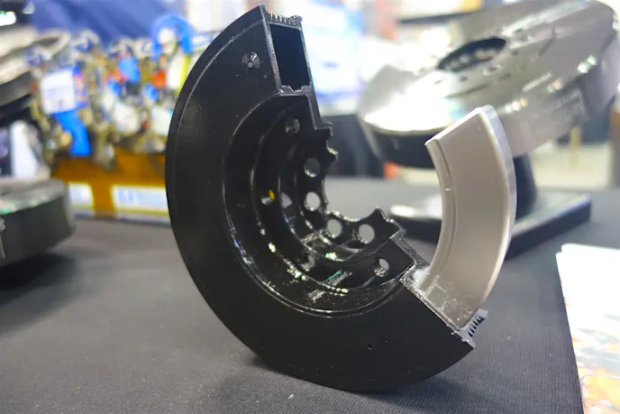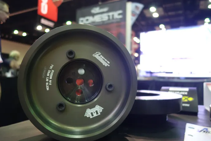“What separate ours from a rubber or elastomeric-style damper is that we use a viscous fluid technology,” Ivan Snyder of Fluidampr told us at The PRI Show. “…All of our dampers are manufactured the same way. We CNC machine this housing, we drop this inertia ring in there and we laser weld the cover on.”