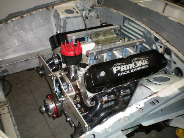 A 25.3 cage was constructed, mini tubs installed and most of the other fabrication to the body and frame finished, then it was off to paint last September. Here the Pro Line built small block Ford sits between the rails for mockup. Photo courtesy Pro Fab Performance.