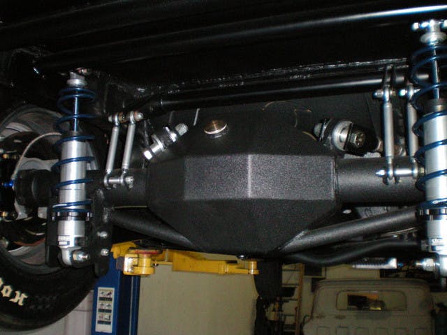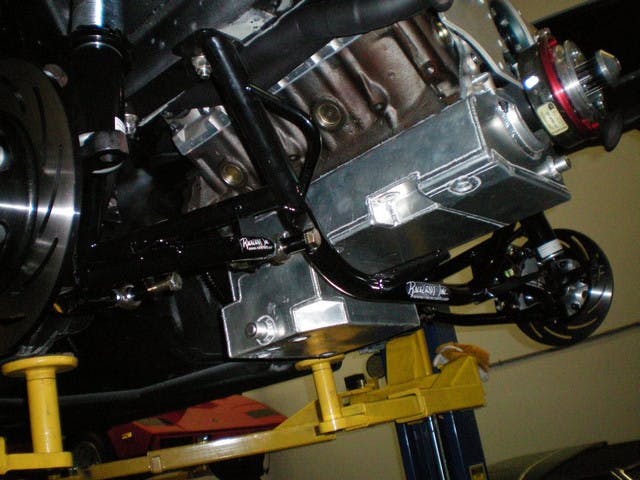 Once back at the shop the engine was set in place, then the Coan spragless TH 400 and Pro Torque converter mated together and installed from the bottom. The front has a full Racecraft Suspension and K-Member with Strange brakes and double adjustable struts. Photo courtesy Pro Fab Performance