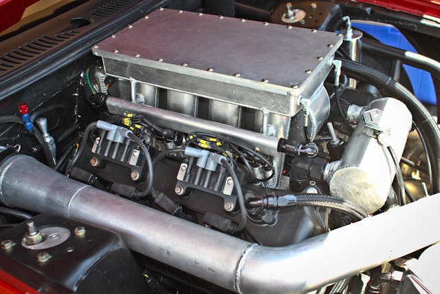The Wold’s bolted on a ProCharger and got it dialed in with a FAST EFI and ignition system and proceeded to put the five-speed Mustang into the nines. But in short order, Sandi admitted it still wasn’t quick enough. At that point, John took the next logical step by outfitting the car with a turbocharger and double overhead cam combination that put the car well into the eights. Naturally, however, longevity issues creeped in as the cylinder walls cracked and valve seats began pushing out, leading them to propose a more purpose-built powerplant.