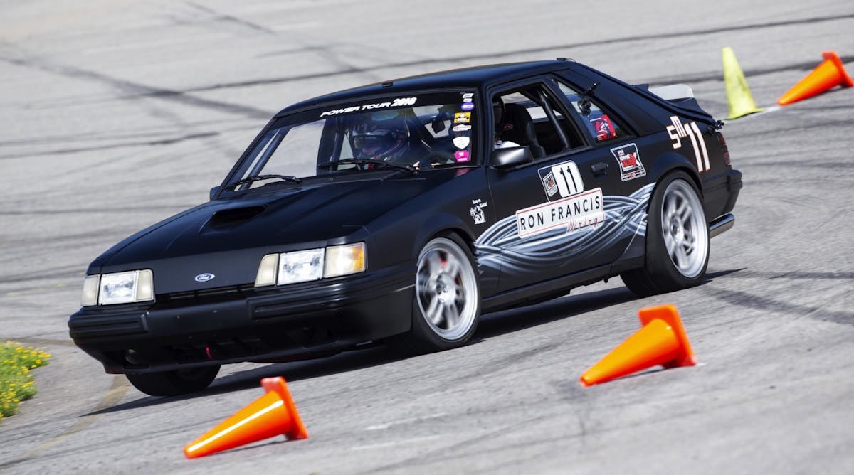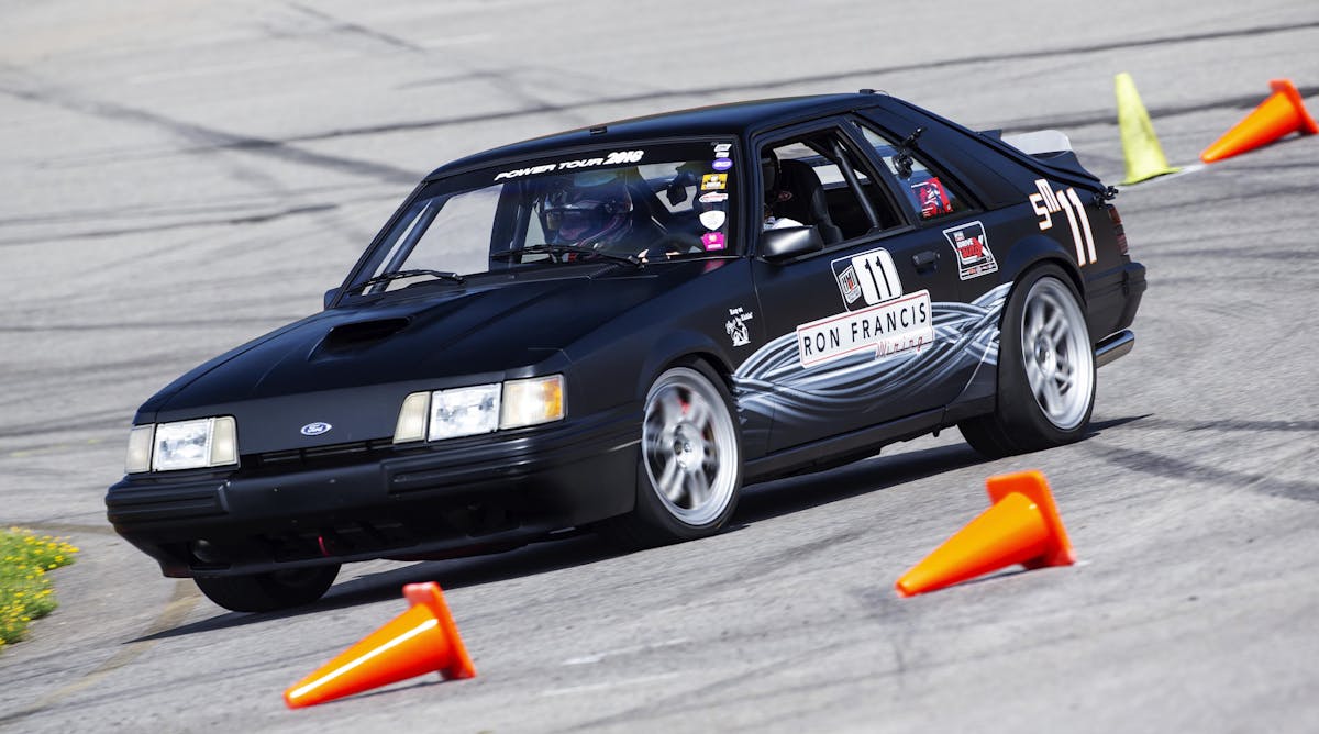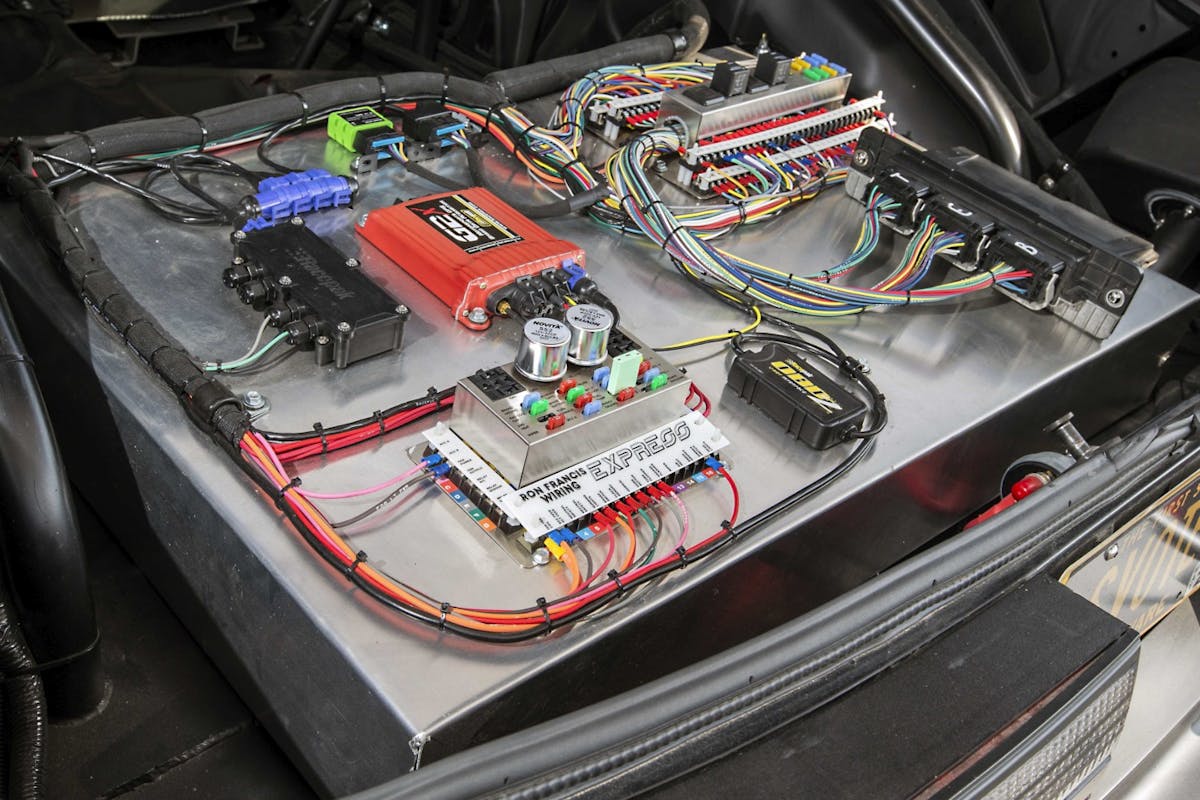 The Coyote-swapped SVO has become a display vehicle and proving ground for Ron Francis Wiring. “This car is totally streetable and it spends time at Goodguys autocrosses and UMI events,” said Scott. The wiring display plate in the hatch area of the vehicle serves two purposes: ease of access and it’s a great promotional tool. “Folks want to see what a fuel injection harness looks like,” said Scott. “So we show it all to them. They ECU everything.” When it comes to the big Coyote in the small Fox-body Scott says thermally, there are no issues with the car. “I drive this car all over, I don’t feel any heat coming through the firewall and I don’t even have any Dynamat in the car.”