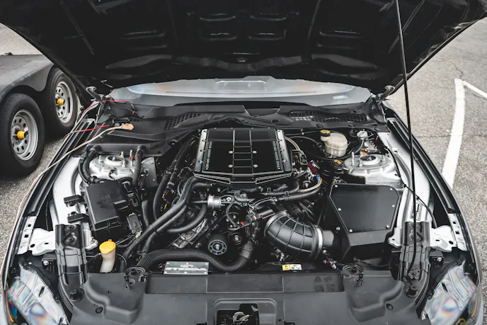 “We had a few low mileage 2019 Mustang short blocks laying around the shop, so we decided to go ahead and run what we have, instead of waiting on backordered pistons,” said Boda. “Then, we installed a set of Comp Cams and good heads on top. After the motor was finished we mounted the new Edelbrock Mustang GT E-Force Stage 2 supercharger kit. We got a little aggressive and swapped in a 2.5-inch pulley, instead of using the 3.25 that came with the kit. The motor was backed by a Circle-D Specialities torque converter. At this point we wanted to recognize our true goal of becoming an 8-second car while still retaining reliable street car manners.”