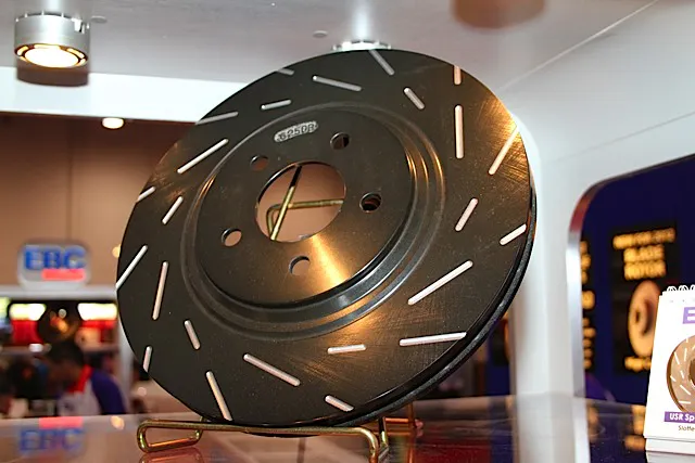 EBC also makes premium OE replacement and high performance brake rotors - This is their GD Series Sport Slotted Rotor, which features wide aperture scraper slots and blind-drilled degassing holes. The black anodized finish marks this rotor as a domestic application.