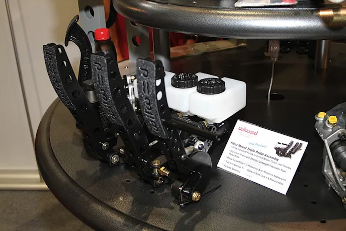 At the other end of the brake lines, Wilwood was showing off their bottom-hinged pedal setup that not only incorporates a hydraulic clutch pedal, a brake pedal with dual master cylinders and adjustable bias, but an integrated throttle pedal as well. The brake and clutch are set up with a nominal 5.25-1 ratio, and the frame is constructed from aluminum, with the pedals fabricated from high strength steel.