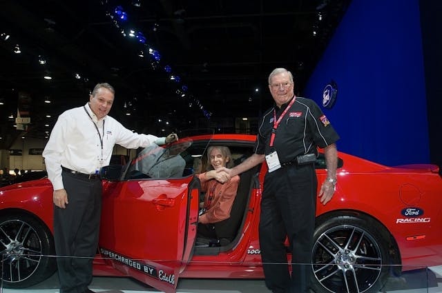 There’s all manner of big events that take place at SEMA, the aftermarket’s biggest show of the year. One of those is the giveaway of the Edelbrock 75th anniversary 2013 Mustang. Nine months ago Edelbrock began a giveaway contest, which according to Edelbrock’s Eric Blakely received more than 641,000 entires, from over 250,000 individuals (you could enter more than once). Over 985,000 people visited the contest page during the contest period.