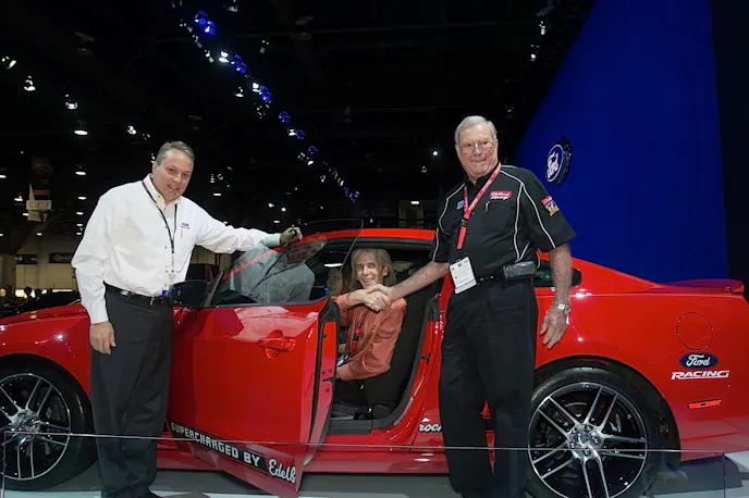 Of the over quarter-million people who entered, Lonnie Hammock submitted his name a dozen times, which was good enough to net him the keys. Hammock and his wife Lorraine, from Pahrump, Nevada were brought to the SEMA show in style courtesy of Edelbrock. When they leave, the car will be sent back to their home. Vic Edelbrock was on hand to personally hand the keys to the Hammocks along with Ford’s George Goddu.