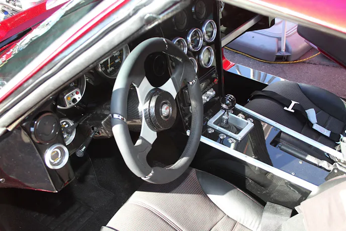 A widened rear track and an extra 8 inches of overall width in back, plus front fenders that were split, widened an inch in front tapering to stock dimensions at the door edge, accentuate the Corvette’s natural curves and wasp-waisted planform. Then there are those doors…