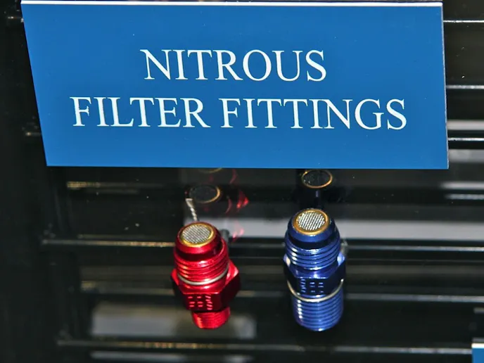 The nitrous fittings are offered offered in a variety of sizes in blue and one fitting is offered in red.
