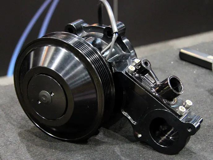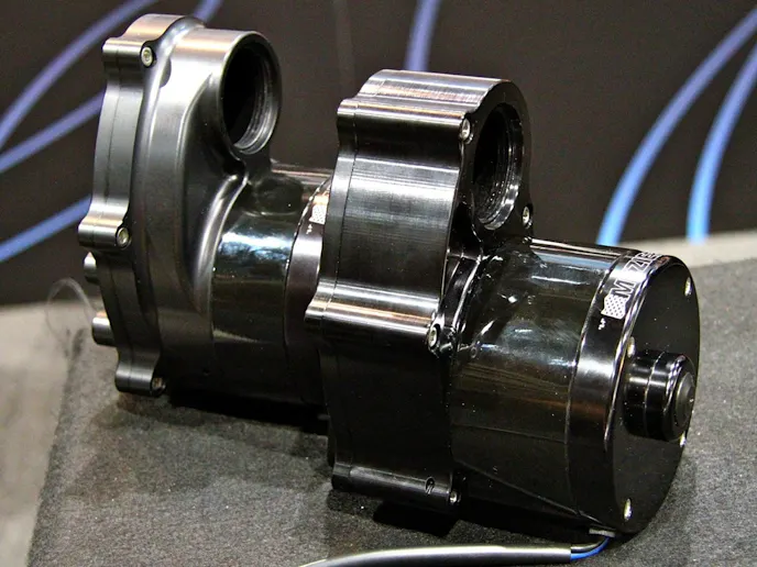 Meziere also showed off a new pump that is a direct replacement for the Ford Coyote engine and has a 55 gpm rating (PN WP336S). It features a fully CNC-machined thermostat housing, and the idler design allows the user to keep all serpentine-belt-driven accessories.
