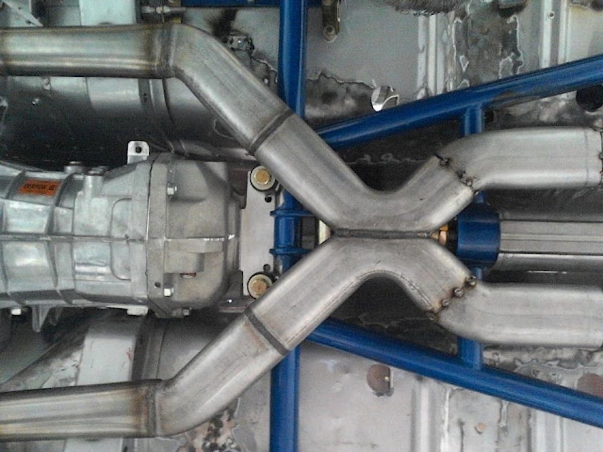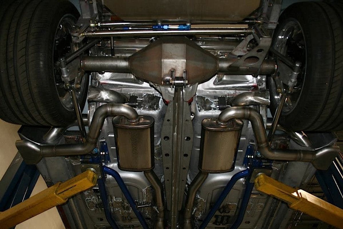 The exhaust system was completely custom built by Magnaflow and tuned specifically for the car. Beneath the car, the exhaust has been ovalized to provide additional ground clearance. Waitas says that the system required significant custom work and fitting to make sure it cleared the car’s suspension and other components. Note the side exits just in front of the rear tires, which also had to clear the functional rear brake cooling ducts.