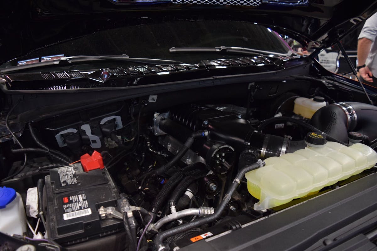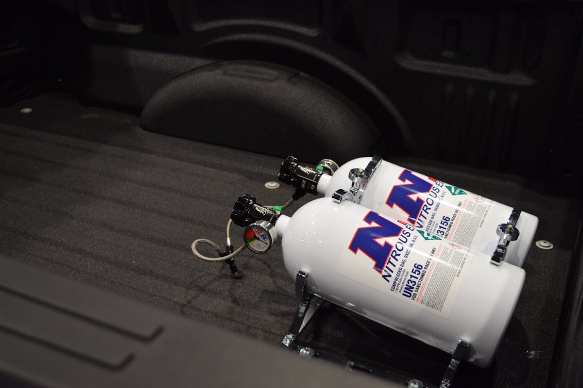 The Lightning-inspired 2019 F-150 belongs to husband-and-wife team Justin and Danielle Norton of Atlanta Custom Wraps. It features Lebanon Ford’s LFP725 F-150 Package. This is a dealer-installed package that includes a Whipple supercharger, Lund Racing tune, and Team Beefcake Racing technical support. The Nortons also decided to install a Nitrous Express nitrous system.