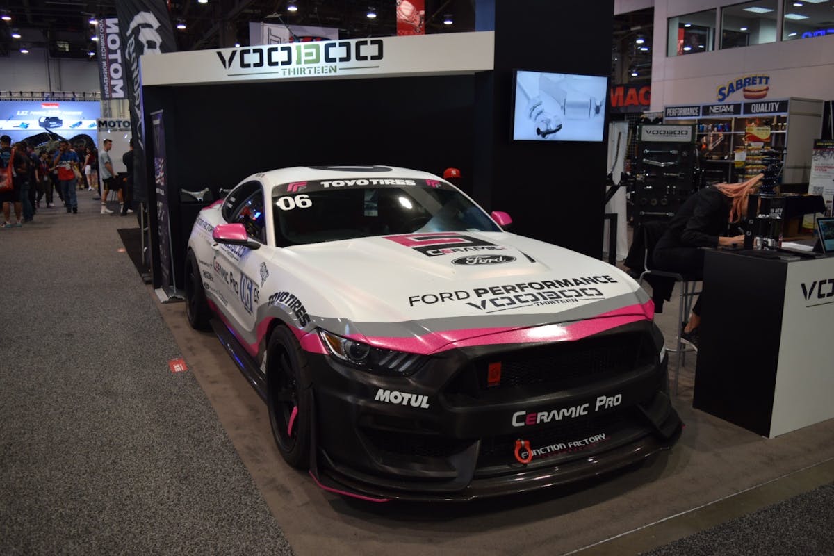 While wandering through SEMA on day four (we made it!), we saw a booth that caught our eye. It was hard to miss the bright pink on the wrap of an S550 Mustang, along with the booth’s military-styled olive green branding. Upon closer inspection, we realized that it was not a company we were familiar with — Voodoo13.