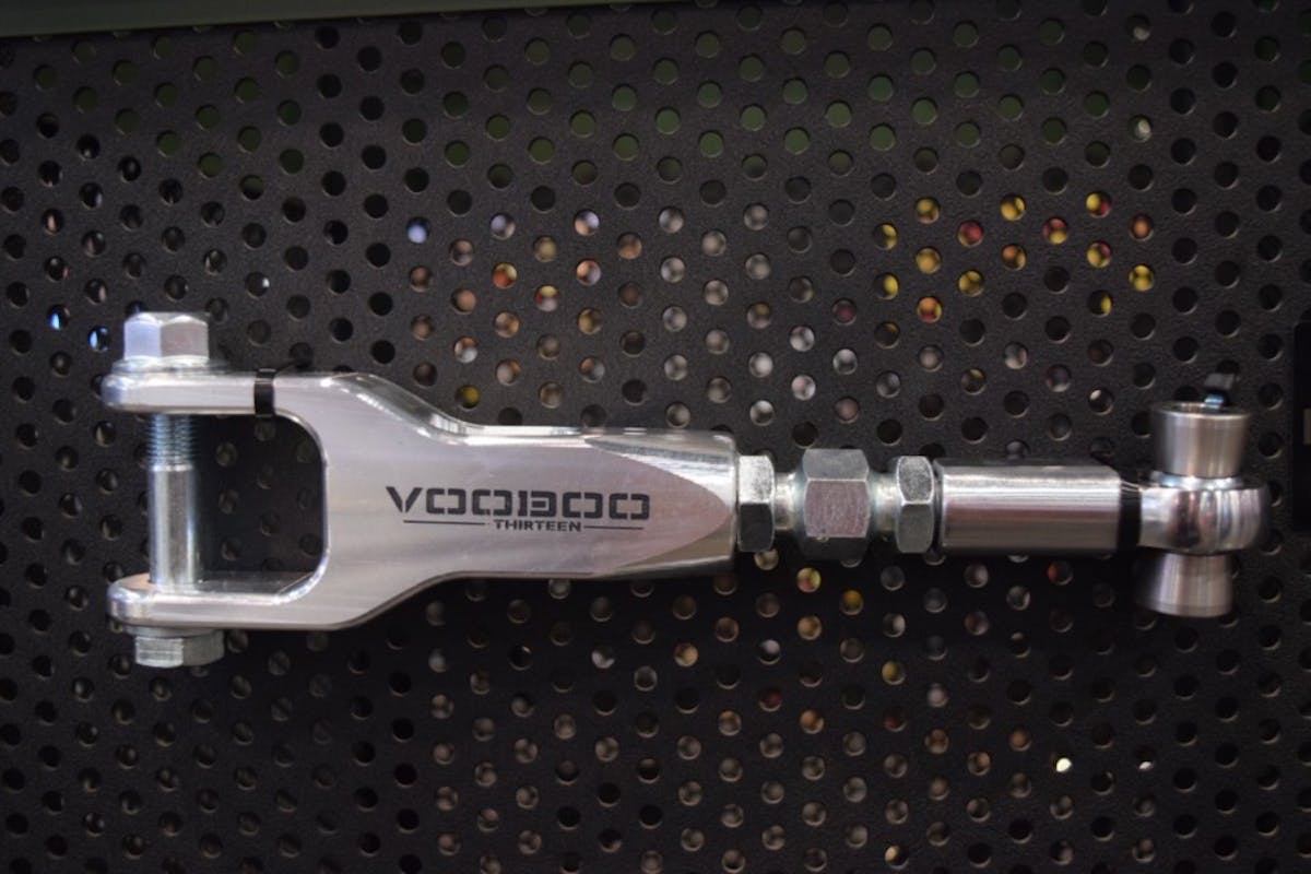Voodoo13’s rear adjustable toe arms for 2015-2017 Mustangs (except GT350) are built for lowered Mustangs with maxed out OEM eccentric adjusters. The arms offer a range of plus or minus 5 degrees relative to the stock toe arm. Voodoo13 designed the arms for on-car adjustment, with adjustment on the subframe side in an effort to reduce un-sprung weight. They feature QA1 PTFE lined heim joints and QA1 XM series rod ends. Chromoly turnbuckle adjusters along with the aforementioned female rod end make adjustment easy, and the rod ends eliminate the play that comes from stock rubber bushings, improving handling. The arms weigh 2.08 pounds each, for a total weight savings of .84 pounds over stock, and are available in two finishes: raw metal or hard clear anodized (gunmetal grey). Installation takes about two and a half hours.