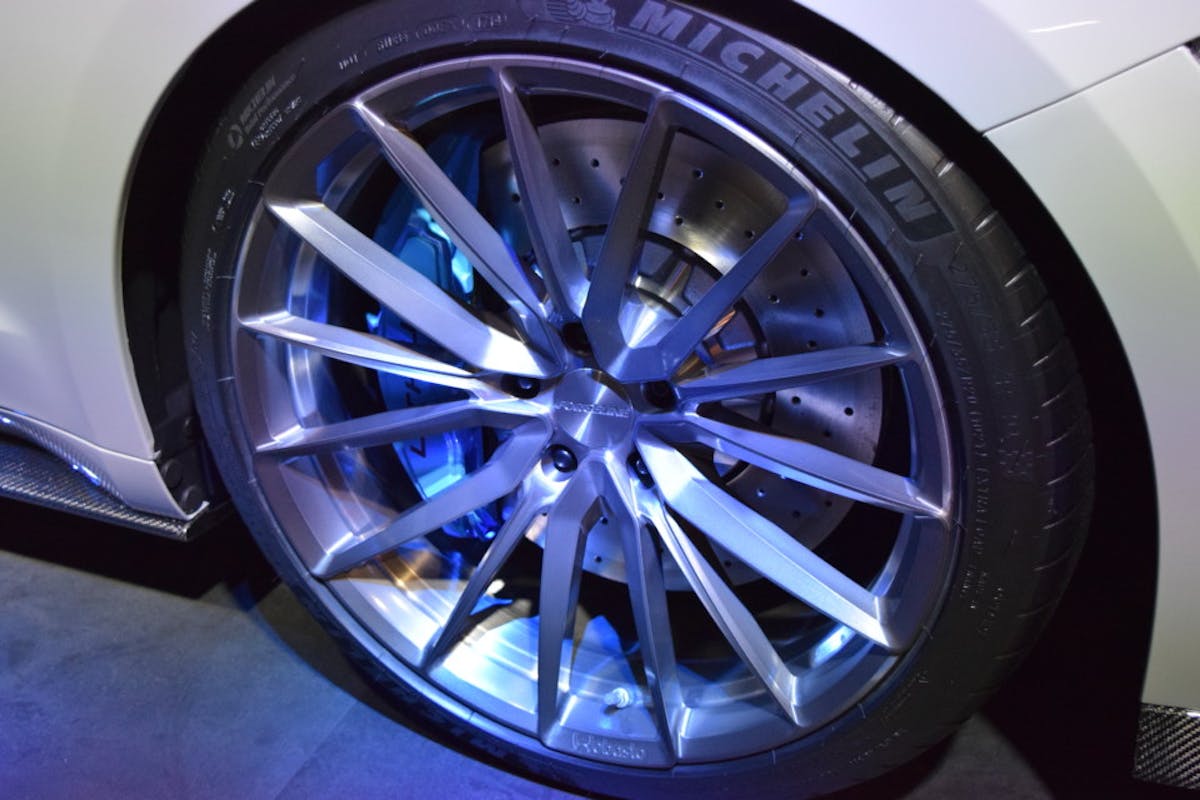 The 20-inch Forgeline wheels are wrapped in Michelin Pilot Sport 4S tires, complimented by six-piston Brembo brakes from the Shelby GT350R upfront.