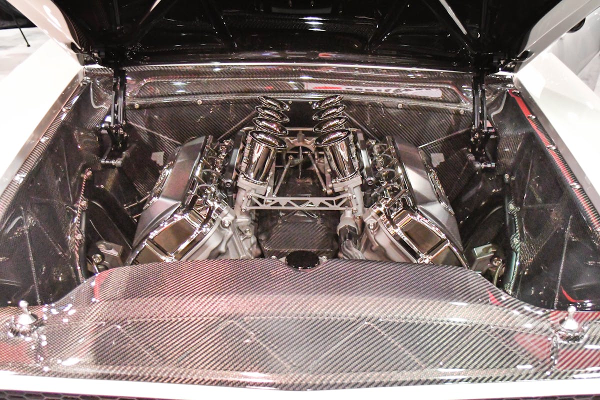 Upon inspecting the exterior, the seamlessly redesigned aesthetics stand out distinctly from the original build. Notably, the front end underwent a significant transformation, incorporating a one-piece design to address factory lines and misalignments. This modification also allowed for a reworked lower valance featuring an added lower intake. Crowned atop this reconstructed front end is a customized carbon-fiber hood, complete with a recessed hood scoop.