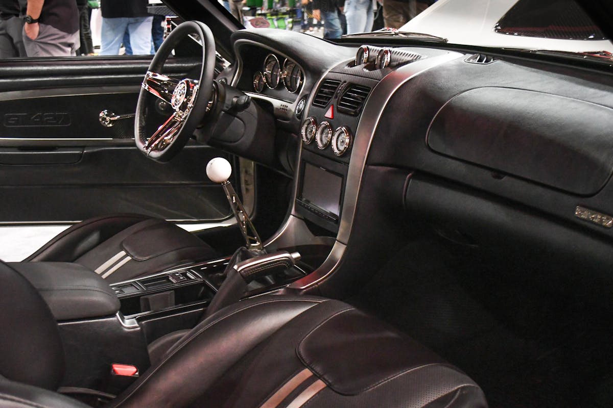 Stepping into the cabin would almost make you question if you’re still in a 1965 Mustang chassis. The Sabelt seats, designed to secure occupants even in the swiftest vehicles, have been reupholstered in leather, featuring vertical stripes on the front and back. A custom-fitted dashboard envelops the front, accompanied by a Sparc 3D steering wheel welcoming the driver. The dash is adorned with bespoke gauges from Classic Instruments, embellished with GT427 insignia throughout.