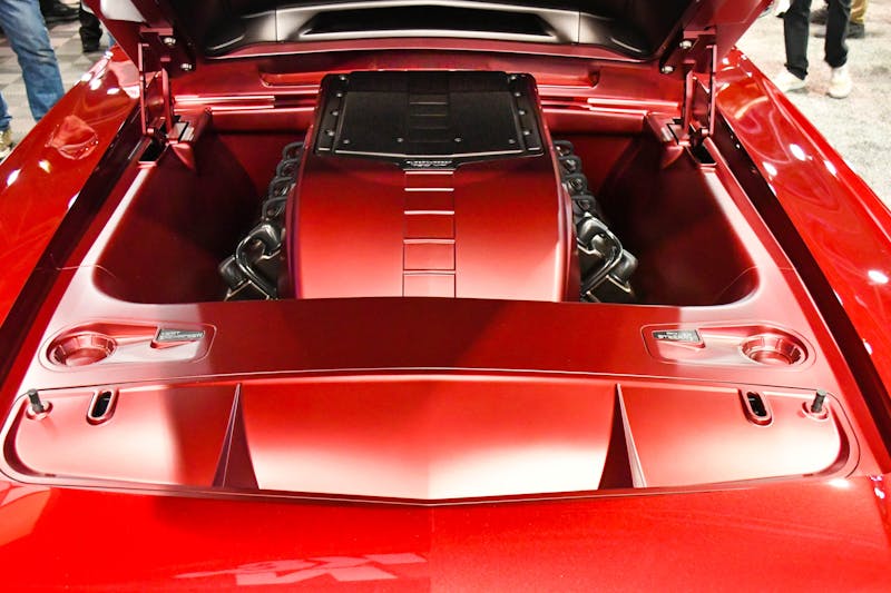 While the exterior is bound to draw much attention, the real spectacle lies beneath the hood. The engine compartment boasts hand-fabricated aluminum components intricately blended with 3D printed panels. Concealed under the engine cover resides a supercharged 5.0-liter Coyote engine delivering an impressive 785 horsepower to the rear wheels.