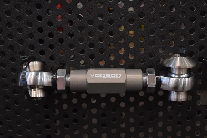 Voodoo13’s rear adjustable toe arms for 2015-2017 Mustangs (except GT350) are built for lowered Mustangs with maxed out OEM eccentric adjusters. The arms offer a range of plus or minus 5 degrees relative to the stock toe arm. Voodoo13 designed the arms for on-car adjustment, with adjustment on the subframe side in an effort to reduce un-sprung weight. They feature QA1 PTFE lined heim joints and QA1 XM series rod ends. Chromoly turnbuckle adjusters along with the aforementioned female rod end make adjustment easy, and the rod ends eliminate the play that comes from stock rubber bushings, improving handling. The arms weigh 2.08 pounds each, for a total weight savings of .84 pounds over stock, and are available in two finishes: raw metal or hard clear anodized (gunmetal grey). Installation takes about two and a half hours.