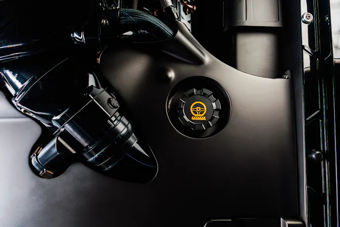 At the heart of KINGPIN is a Wegner Motorsports 5.0-liter Coyote V8 topped with a Whipple supercharger, producing well over 800 horsepower. That power travels through a Bowler Transmissions Carbon Edition six-speed manual gearbox, while Ringbrothers’ custom-fabricated headers and a Flowmaster Super 44 stainless-steel exhaust give the engine its distinctive voice.