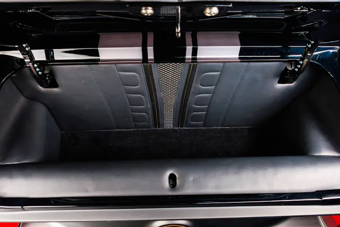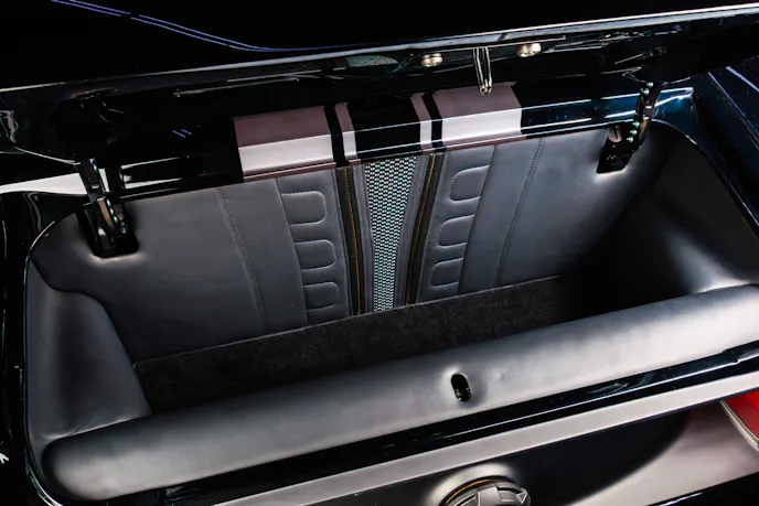 The rear of KINGPIN wears lowered quarter panels that vent through a custom carbon-fiber tail panel and diffuser. Every panel was reworked for function and fit, with clean transitions between metal and carbon elements. The design ties together the wide stance and low profile while maintaining the character of the original Mach 1.