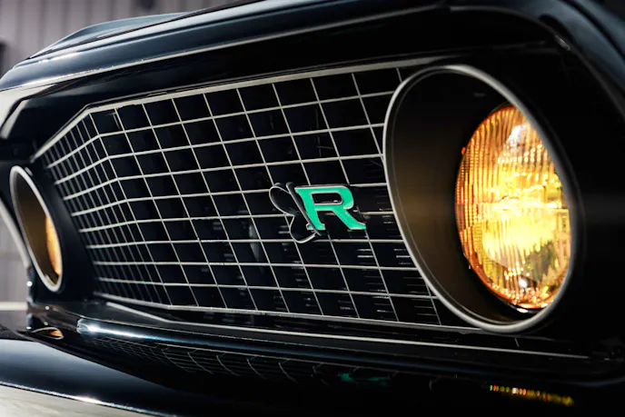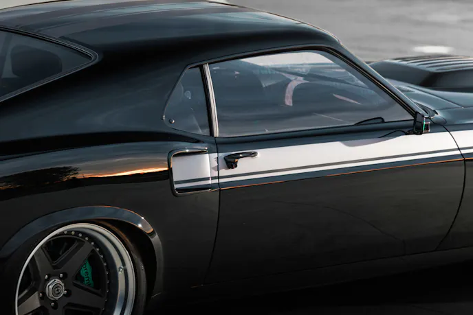 That dramatic redesign is finished in a custom shade of BASF Bootleg Black accented by Grab-Her Green trim, which is an obvious tip of the hat to Ford’s classic Grabber Green, subtly shifted to enhance the car’s moody character. Wide Michelin Pilot Sport 4S tires on HRE Vintage Series 517 wheels complete the stance, while Fox RS single-adjustable coilovers and Roadster Shop independent suspension help KINGPIN stick to the pavement. Stopping power comes courtesy of massive Brembo brakes.