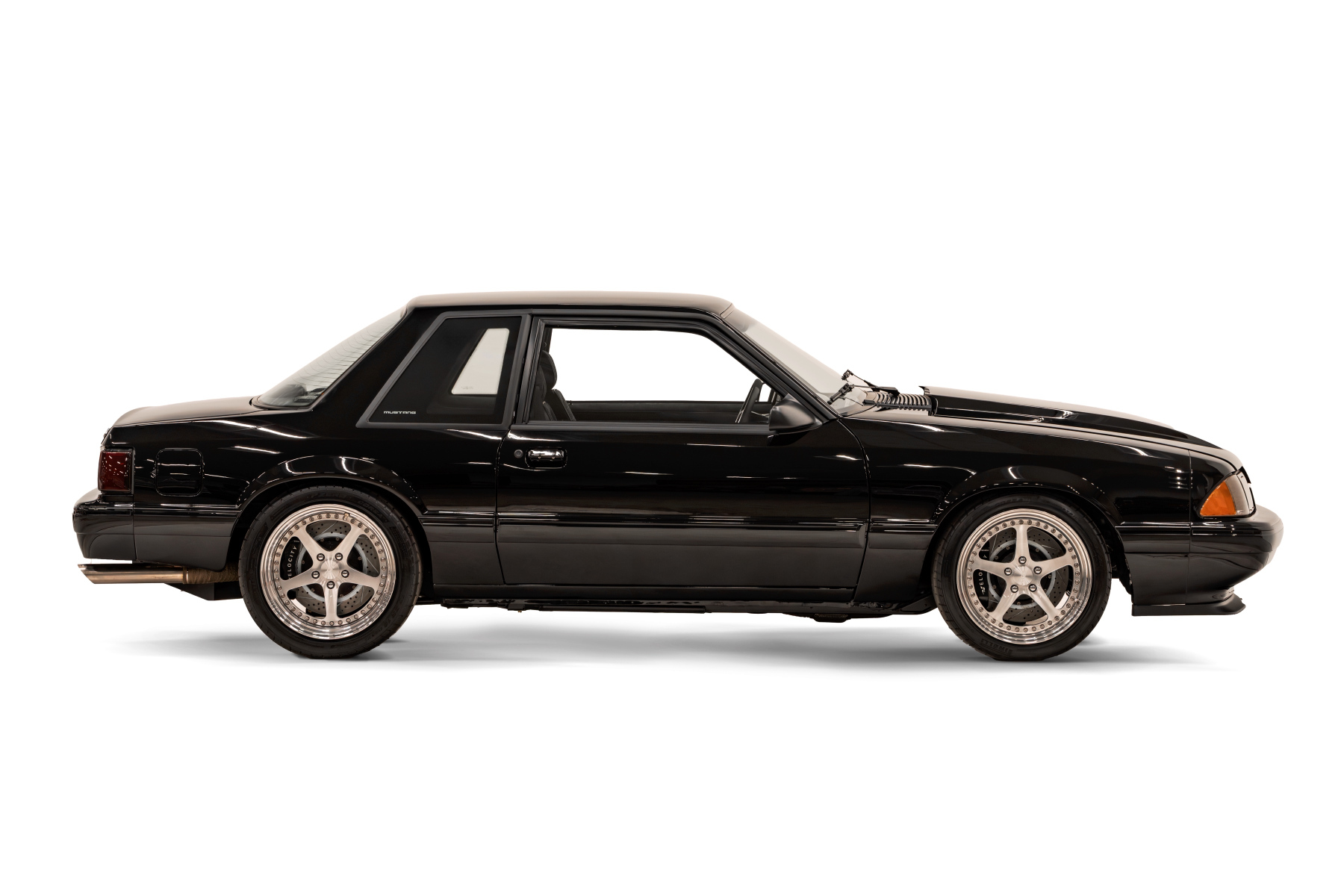 While unmistakably recognizable, the 1991 Mustang’s shape has been elevated with the kind of craftsmanship rarely applied to this era. The Jet Black BASF Glasurit finish gives the body a deep gloss, accentuated by a two-inch cowl hood on Ringbrothers billet hinges and Carter’s Customs side splitters. Under the hood, hand-built closeout panels and precisely aligned bodywork showcase Velocity’s attention to detail and commitment to a factory-plus aesthetic.