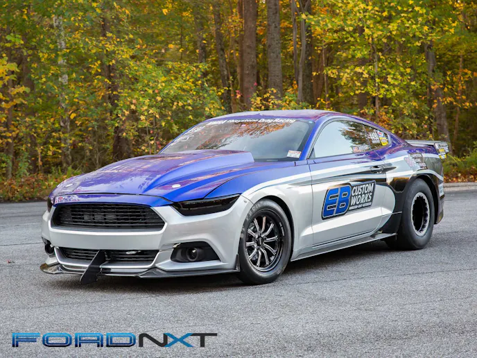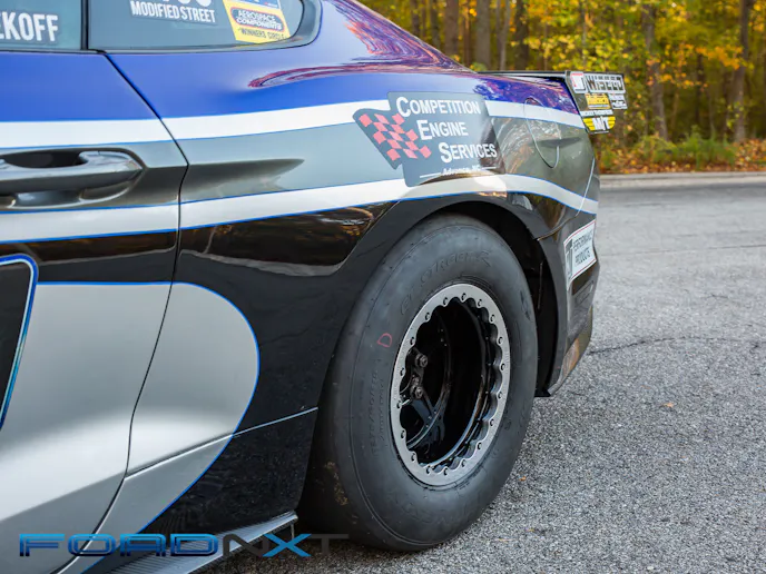 Though most drag cars feature overlooked interiors, this is not one of them. Inside, an Alcantara headliner and door panels flow with Racetech seats and a five-point harness. He designed a custom Mustang rear seat delete as well. The cage was fabricated by Bardekoff and is certified to 7.50.