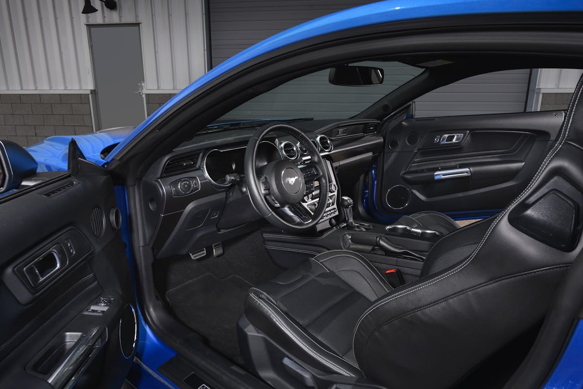For those who want to push the envelope on the road course, you can elect to elevate the performance of a manual-trans Mach 1 by adding the Handling Package. It’s made apparent by its unique, spider-pattern wheels, which are wider than the base wheels at 19×10.5 inches in front and 19×11 inches out back.