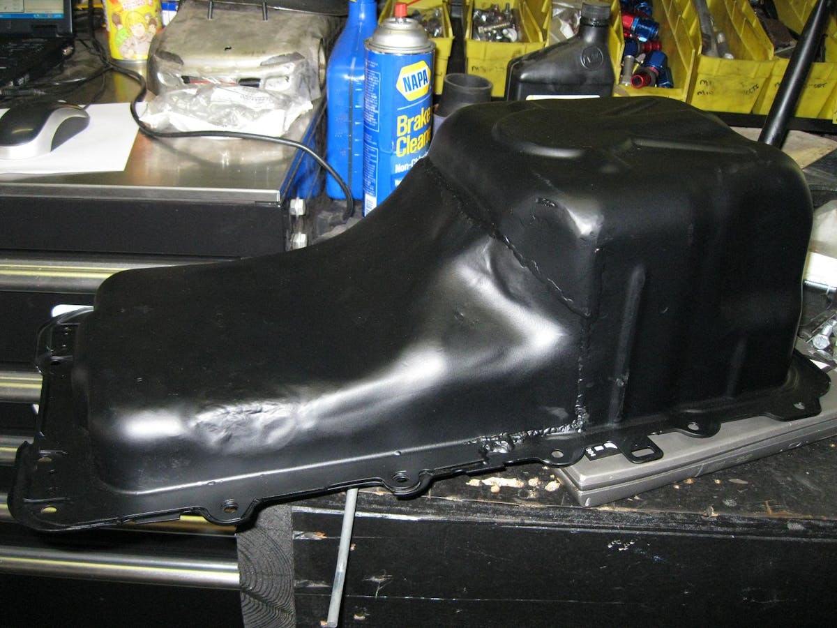 The biggest hurdle on the install was the oil pan. Rumor was that the 4.6 oil pan will bolt to the 5.0 engine, and in this circumstance, it does not. The 4.6 pan is nearly identical until it meets the front cover, then things drastically different. To fit in on the tubular K-member, Taylor fabricated an oil pan that utilized the front half of the 4.6 pan welded to the back half of the 5.0 pan, re-using the stock 5.0 pick up. The stock engine mounts bolted right to the 5.0 block and the engine was in place, though the stock headers are too wide and set of long tubes will be fabricated at S&R Performance.
