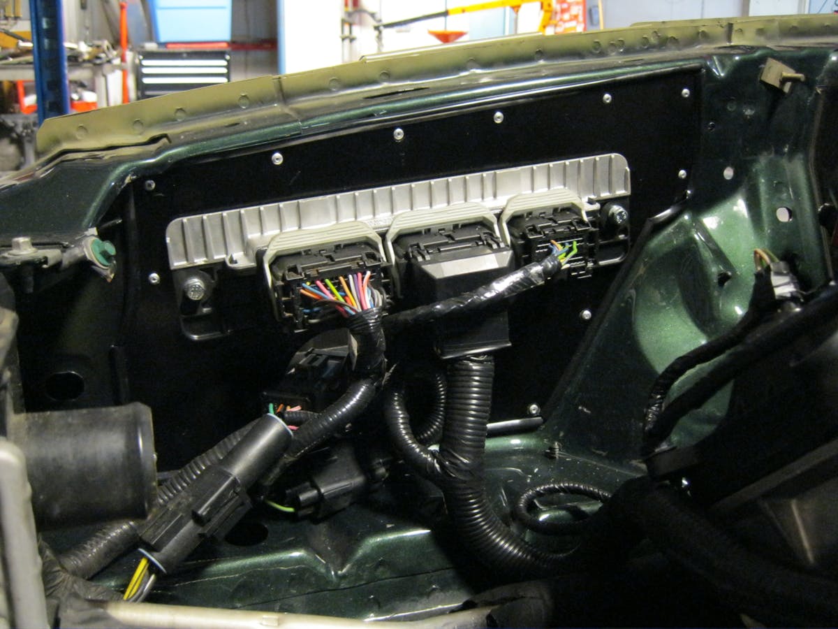 From a wiring perspective, Taylor mentioned the install was pretty easy. The factory wiring that installs in the passenger side fender can mostly be eliminated. The only wires that needed to be relocated was the ABS and headlight wiring. A panel was fabricated in the original spot to hold the new 5.0 ECU.