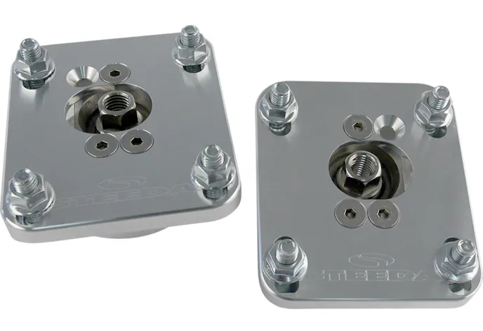 Constructed from billet aluminum and billet steel, the mounts are TIG-welded, nickel-plated, and feature grade 12.9 hardware. They allow for up to -2.3 degrees of negative camber when used in conjunction with stock springs, and up to -3.5 degrees of negative camber when paired to a 2.5-inch coilover spring setup. Caster settings of stock or +.5 degrees are available as well.