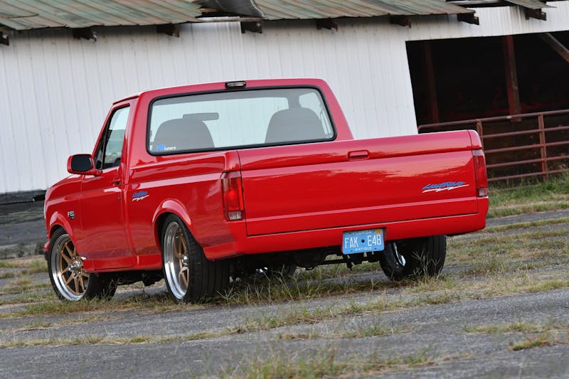 Speaking of bounce, part of the reason why this Lightning stands apart from others is its custom wheels from 3030 Autosport. Newman chose the fitment specifications and had 3030 Autosport manufacture a set of its GO5Y wheels in 20×9-inch front and 20×10-inch rear sizes. He then found a deal on some Porsche Cayenne takeoff Michelin Pilot Super Sport tires, sized P255/40/20 at the front and P295/35/20 at the back. Tucked behind the big hoops are Wilwood 6-piston calipers and 14-inch rotors. Newman utilized a Little Shop Manufacturing kit that allows them to bolt onto the factory spindle and a Bronco Graveyard kit that swaps out the drum brakes for a disc setup.