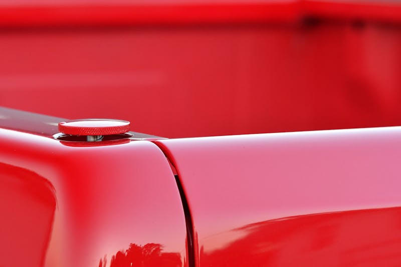 Before the beautiful red exterior was painted, several custom modifications were made to the metal. These include shaving the gas doors, trimming the fender lips, and filling in the stake pockets in the bed sides. Newman and a friend also fitted the aft driver’s side stake pocket with a pop-up gas cap that would normally be used in a motorcycle gas tank.