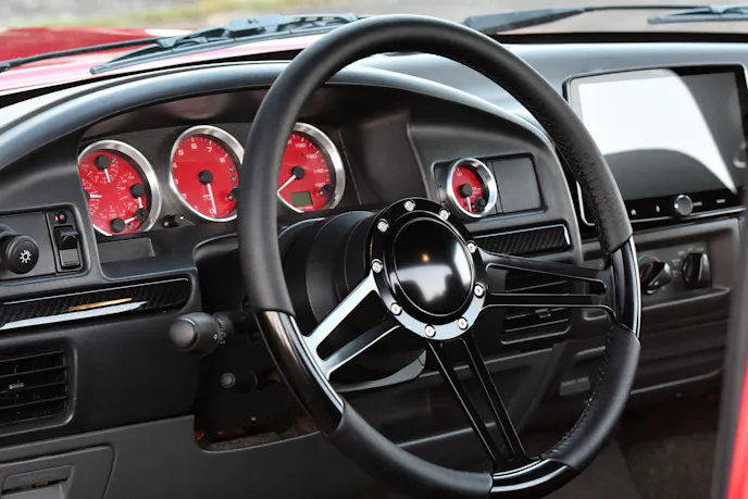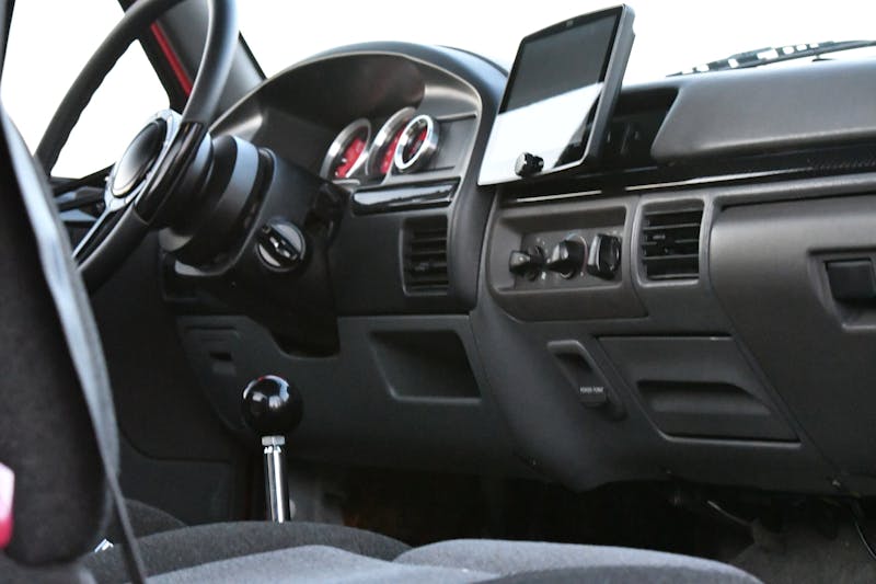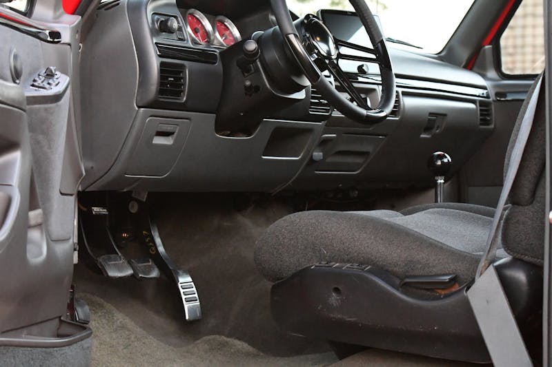 With the cab painted and mounted back on the truck, Newman got to work on the interior. The factory dash, door panels, and bucket seats remain, but the instrument cluster got a significant upgrade with custom 3 3/8-inch gauges from Speedhut.