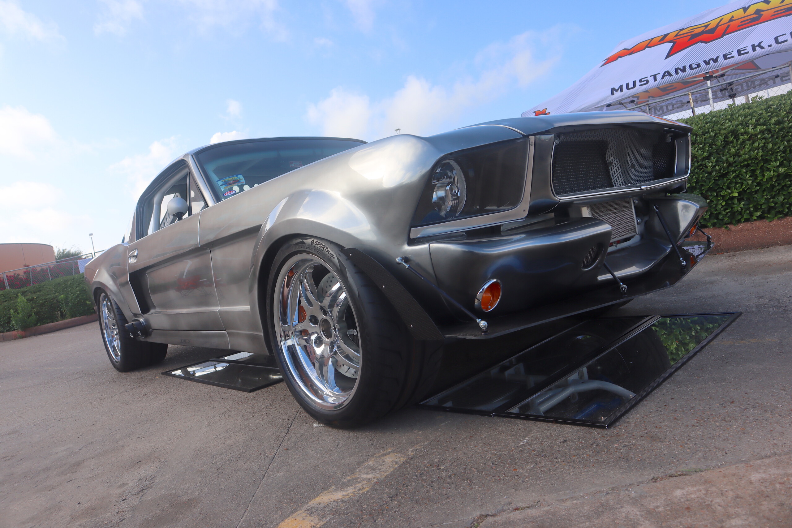 The body features components from almost every Mustang era, including 2000 Mustang fender flares, 2005 taillights, 2014 quarter windows, a 1967 Shelby hood scoop flipped backward for airflow, and 1968 quarter panels.