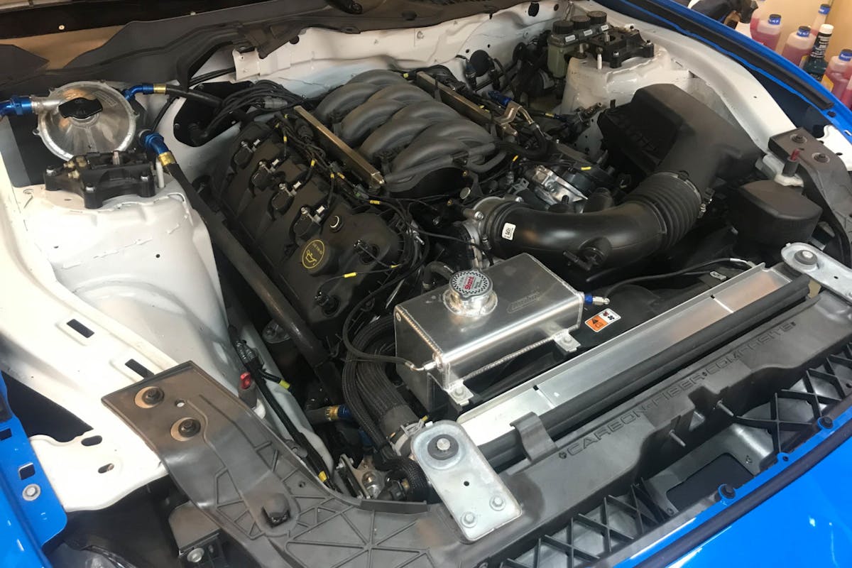 Underneath the 18×11-inch Forgeline GS1R aluminum wheels is a Brembo big brake kit with six-piston calipers and 380mm slotted rotors up front and four-piston calipers with 313mm slotted rotors at the rear. Combined with Performance Friction brake pads and custom carbon-fiber brake ducts, the braking system does not fade fast. More importantly, they inspire confidence. Bosch M4 ABS brings the brake package together. It also sets the Mustang apart from its peers, most of which use a modified OE ABS.