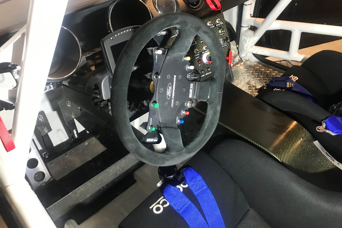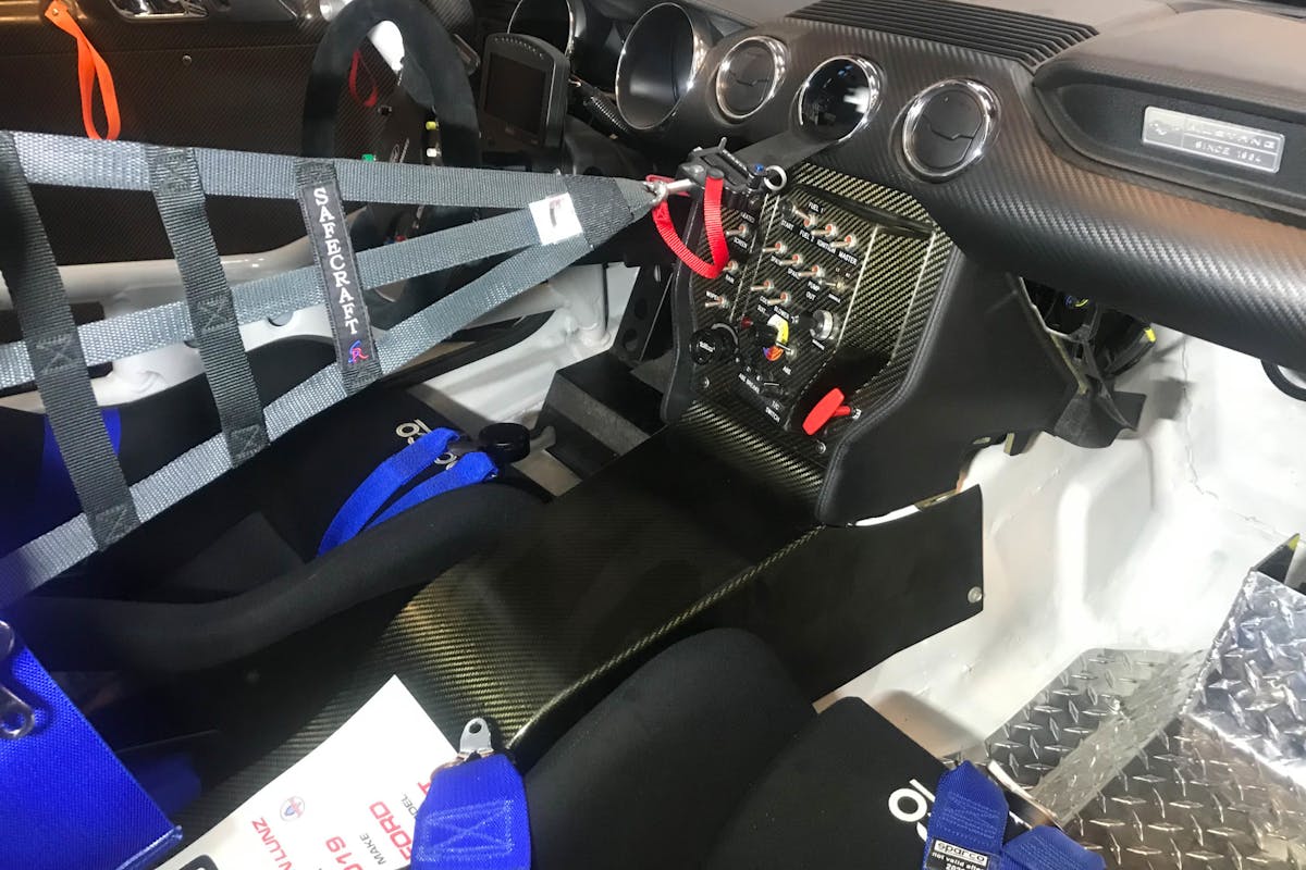 As Lunz likes to scare friends and family in his cars, he requested Multimatic install a second Sparco seat in the cramped cabin. Normally, the ECU and electronics are mounted in the passenger’s area, and it seemed like an impossible request to fulfill. Lunz stood his ground, and after several days of back and forth, his loyalty to the Blue Oval unflinching, Multimatic acquiesced and agreed to build him a two-seater Mustang GT4, doused in a coat of Grabber Blue.