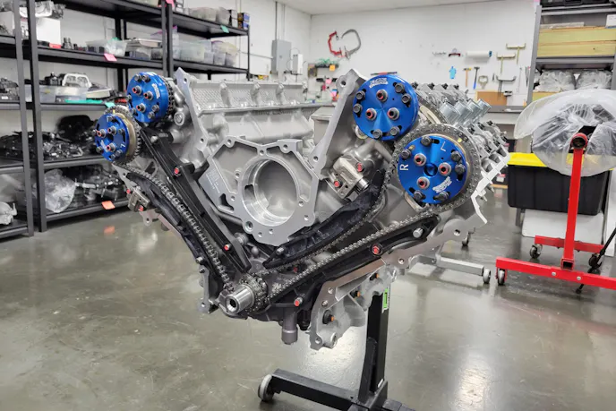 Ensuring that durability is also achieved in this build by addressing known weaknesses. Seasoned Coyote builders know oiling is an Achilles’ heel of the platform. FFRE addressed this with Melling pumps fitted with its own billet gears, validated on an in-house pump dyno. Stock powdered-metal gears are notorious for shattering at high rpm; billet replacements virtually eliminate that failure mode. That means stable oil pressure through an 8,000-rpm pull and consistency on long highway stints.