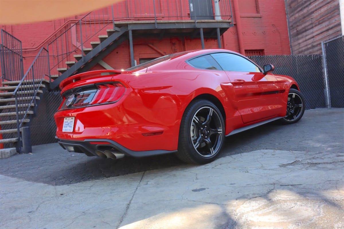 The Cal Special package is all about style, and from the backstage view, its 19-inch wheels, pedestal rear spoiler, and signature faux gas cap badge help it stand out from other Mustangs on the road.