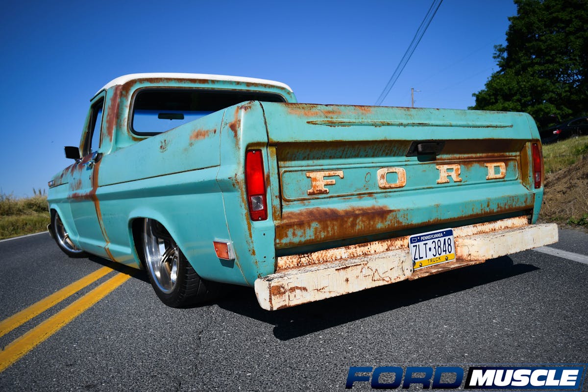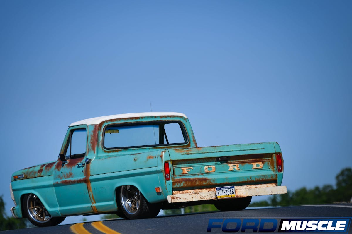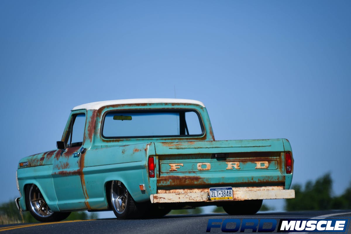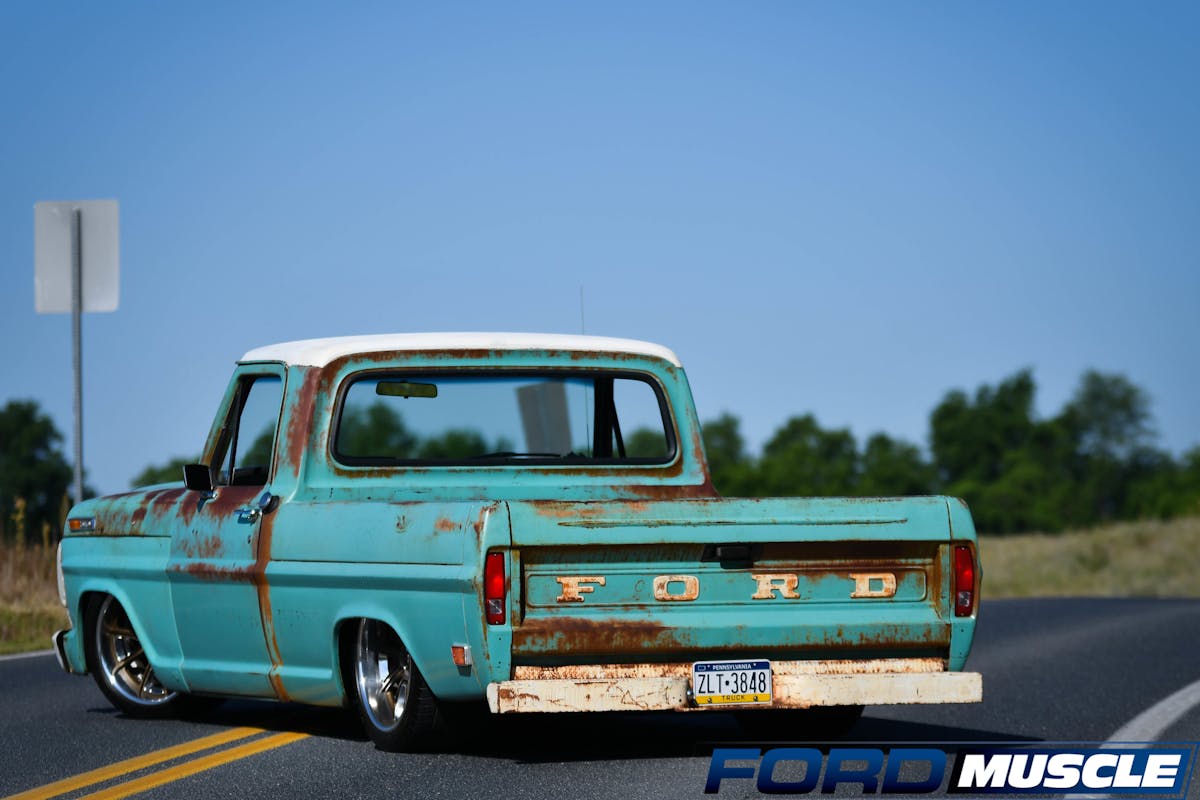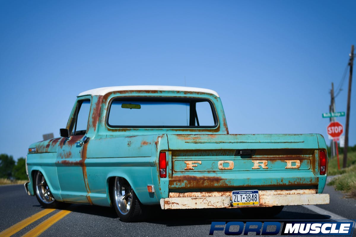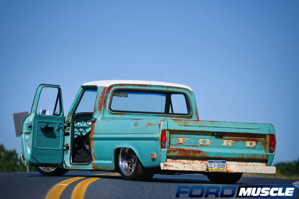 Sands lives in Quakertown, Pennsylvania, and owns a few car dealerships, including two Ford dealerships. About three years ago, Sands was looking for an old Ford truck to tinker on in his home garage. “I figured I would get an F-100, toss in a V8, and probably install a Ford Crown Vic front end,” says Sands. That idea sent him searching the internet to find the perfect starting project. Eventually, he found a 1969 Ford F-100 short-bed Bumpside with a six-cylinder engine and all-original paint on ebay in Missouri. A quick transfer of $5,000 from his bank account and the Ford was his. He brought it home and put it in his garage to begin the process of upgrading the engine and suspension.