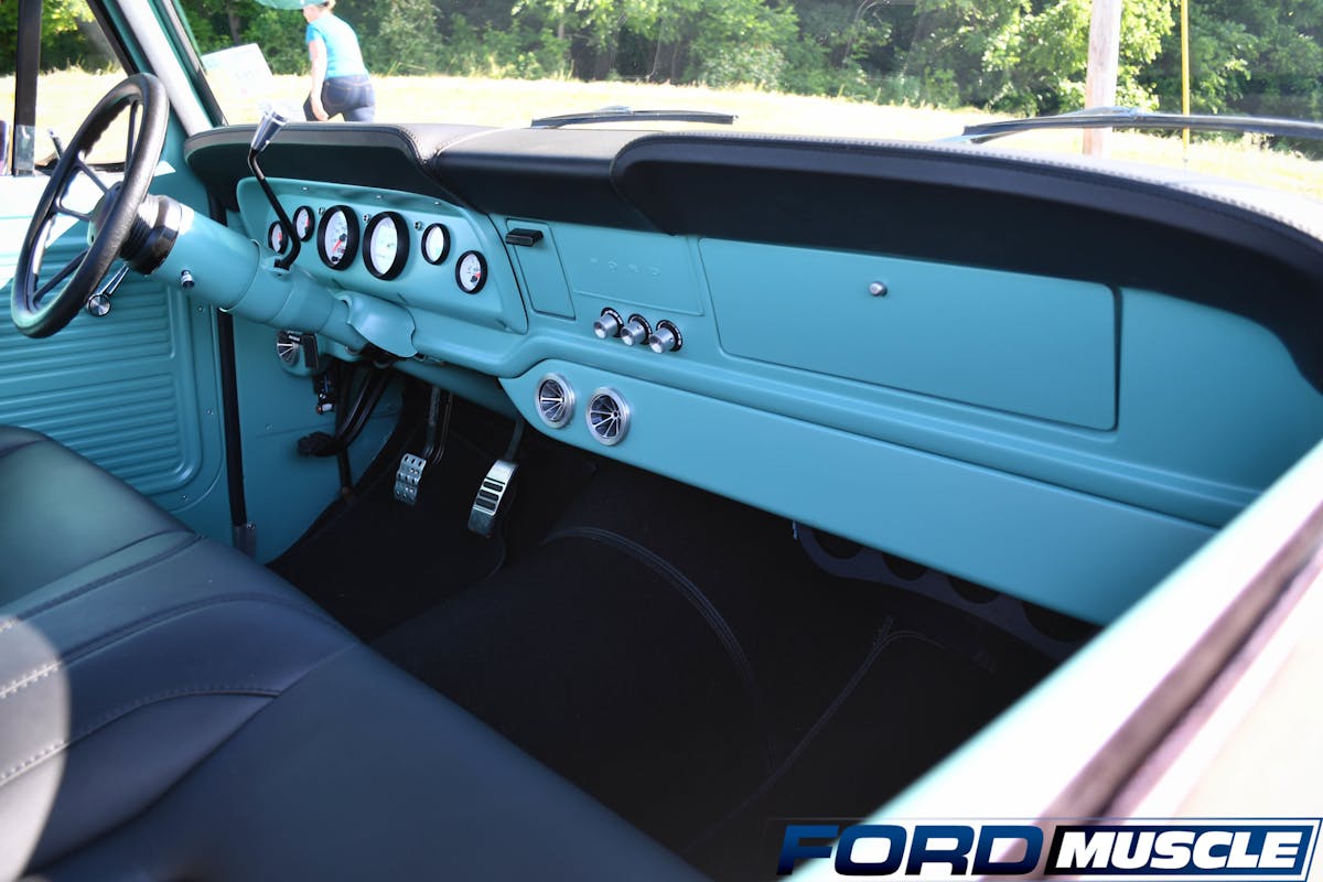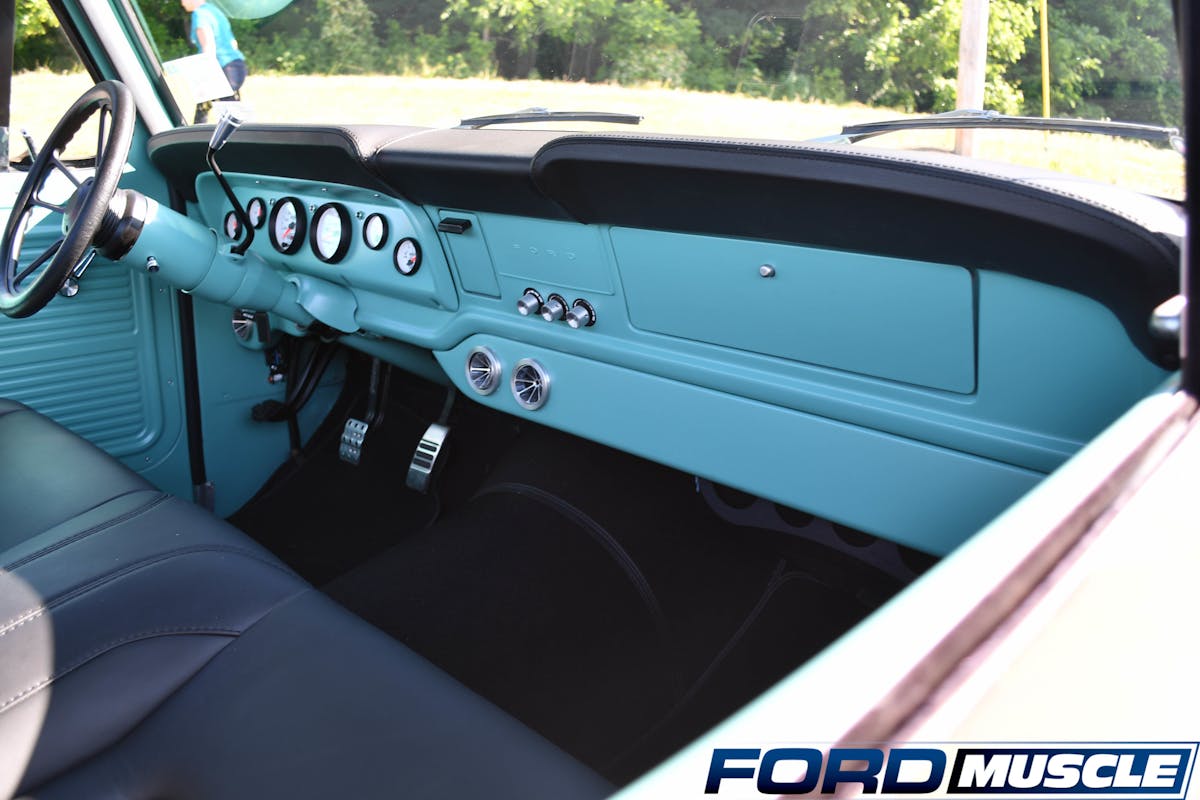 The interior of the F-100 sports Autometer gauges and custom upholstery by Bux Customs, who have won numerous awards at Goodguys shows in the past for their interior work. To keep things modern and comfortable, an air conditioning system was installed from Restomod Air. Ensuring that the 5.0-liter V8 engine always has a steady supply of fuel is a custom fuel tank from Scott’s Hotrods ‘N Customs.