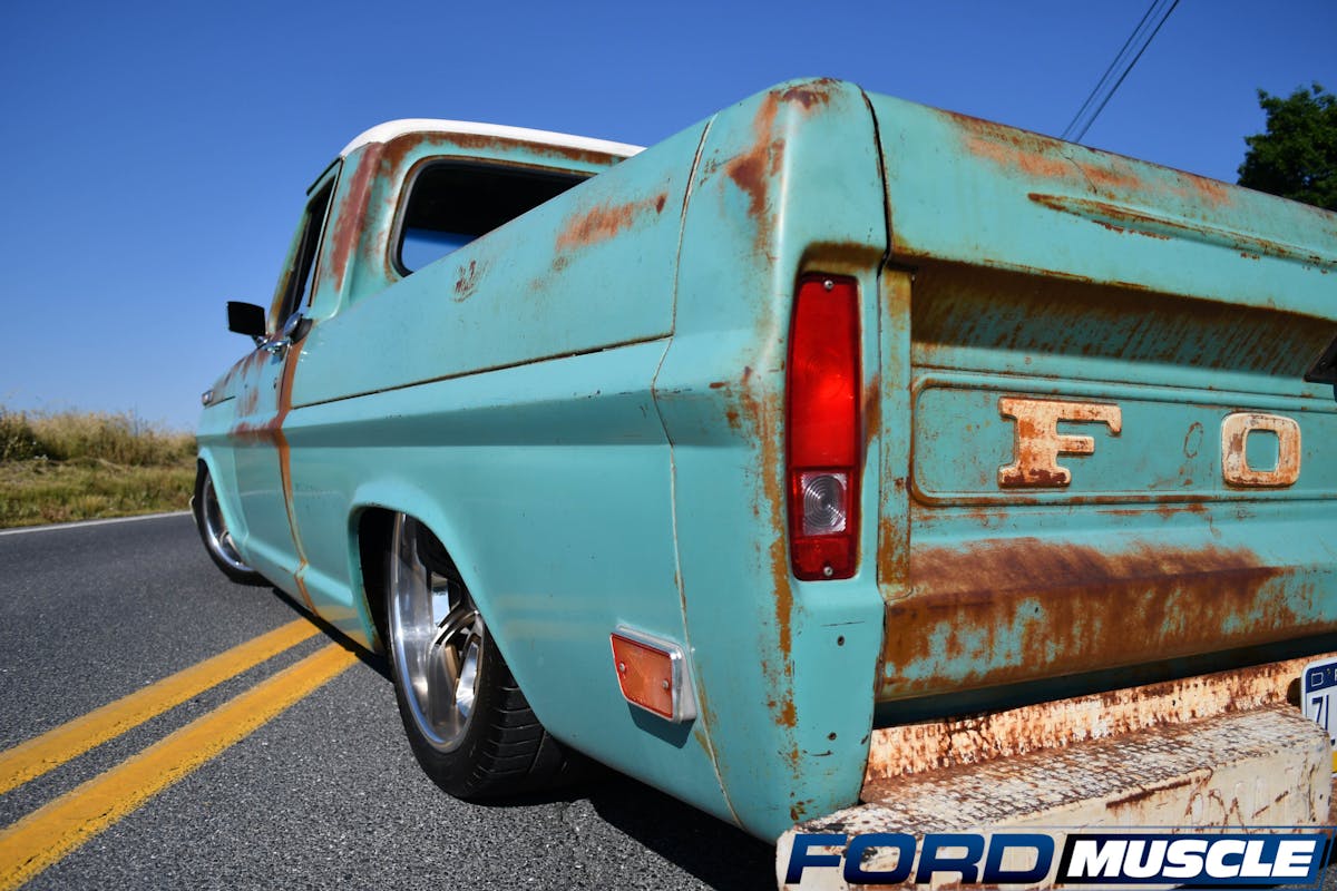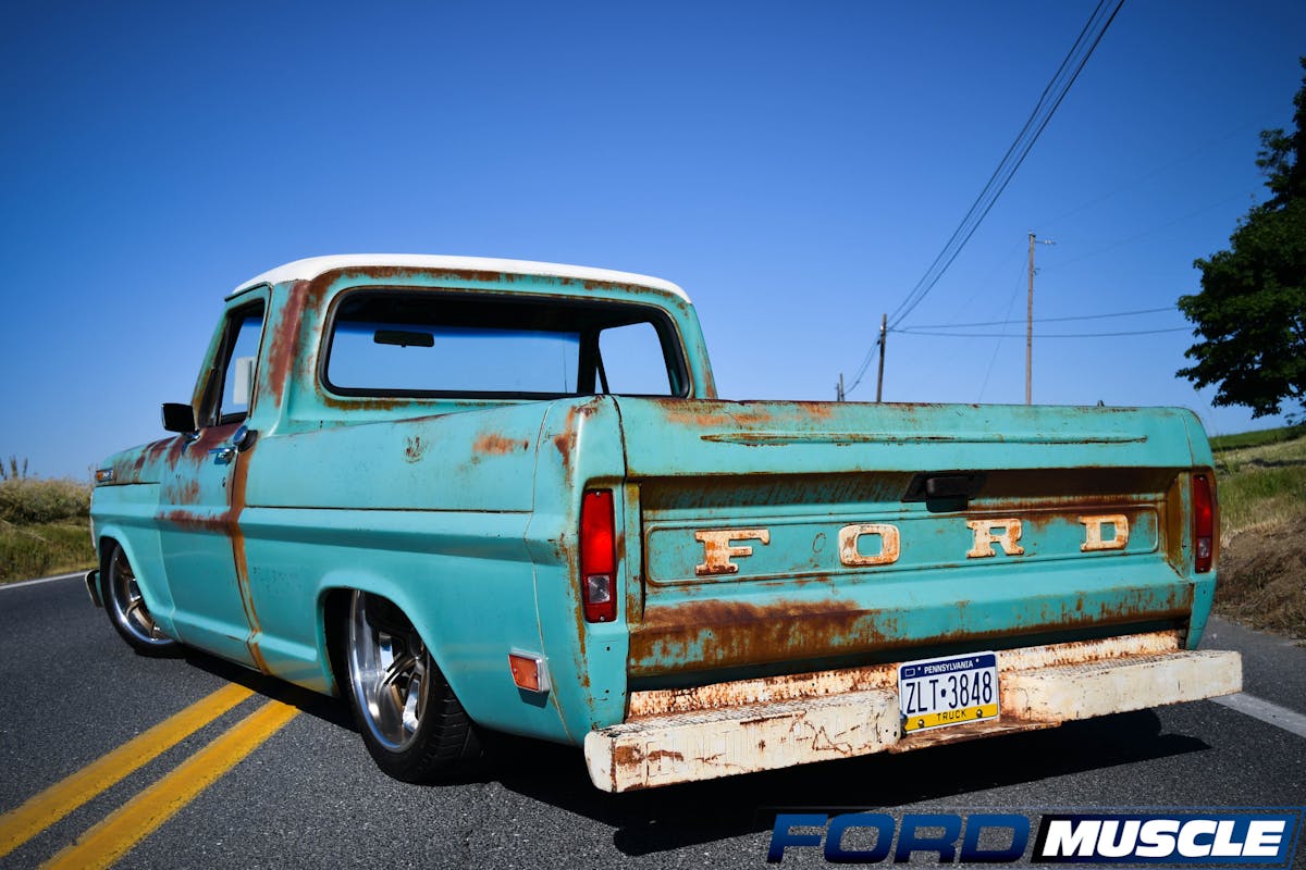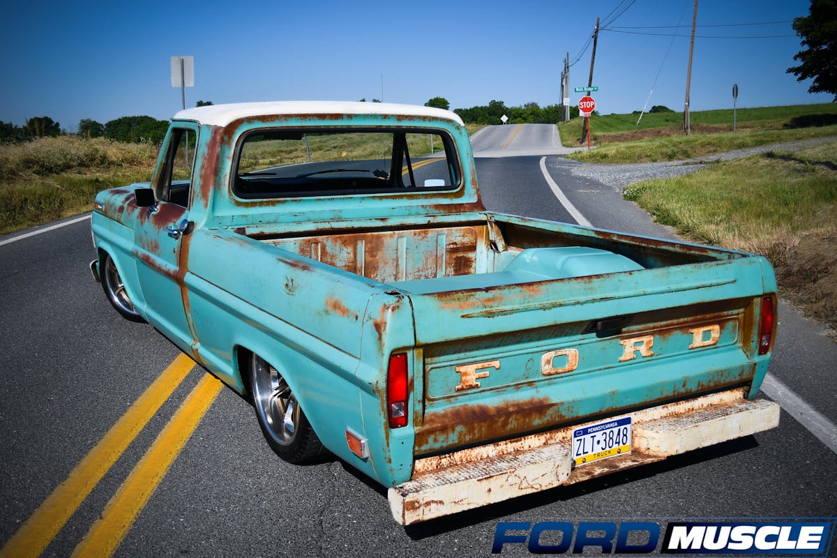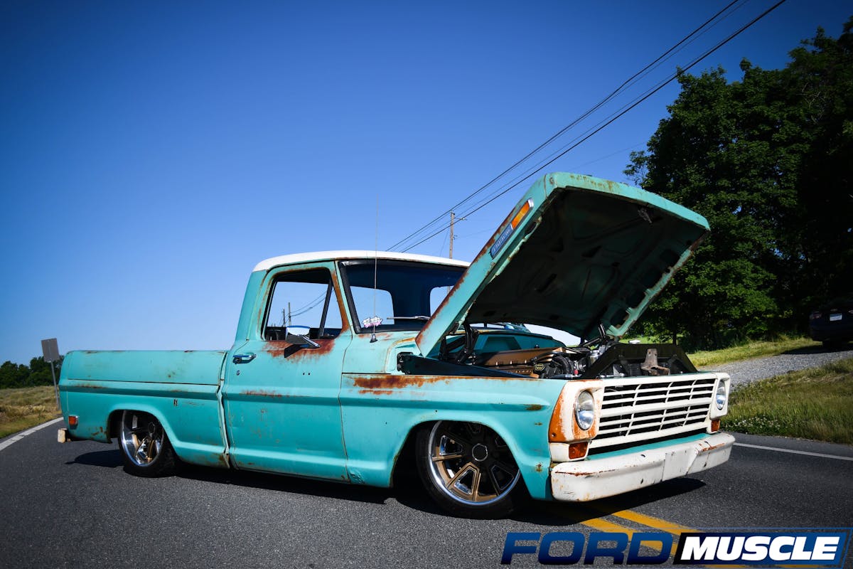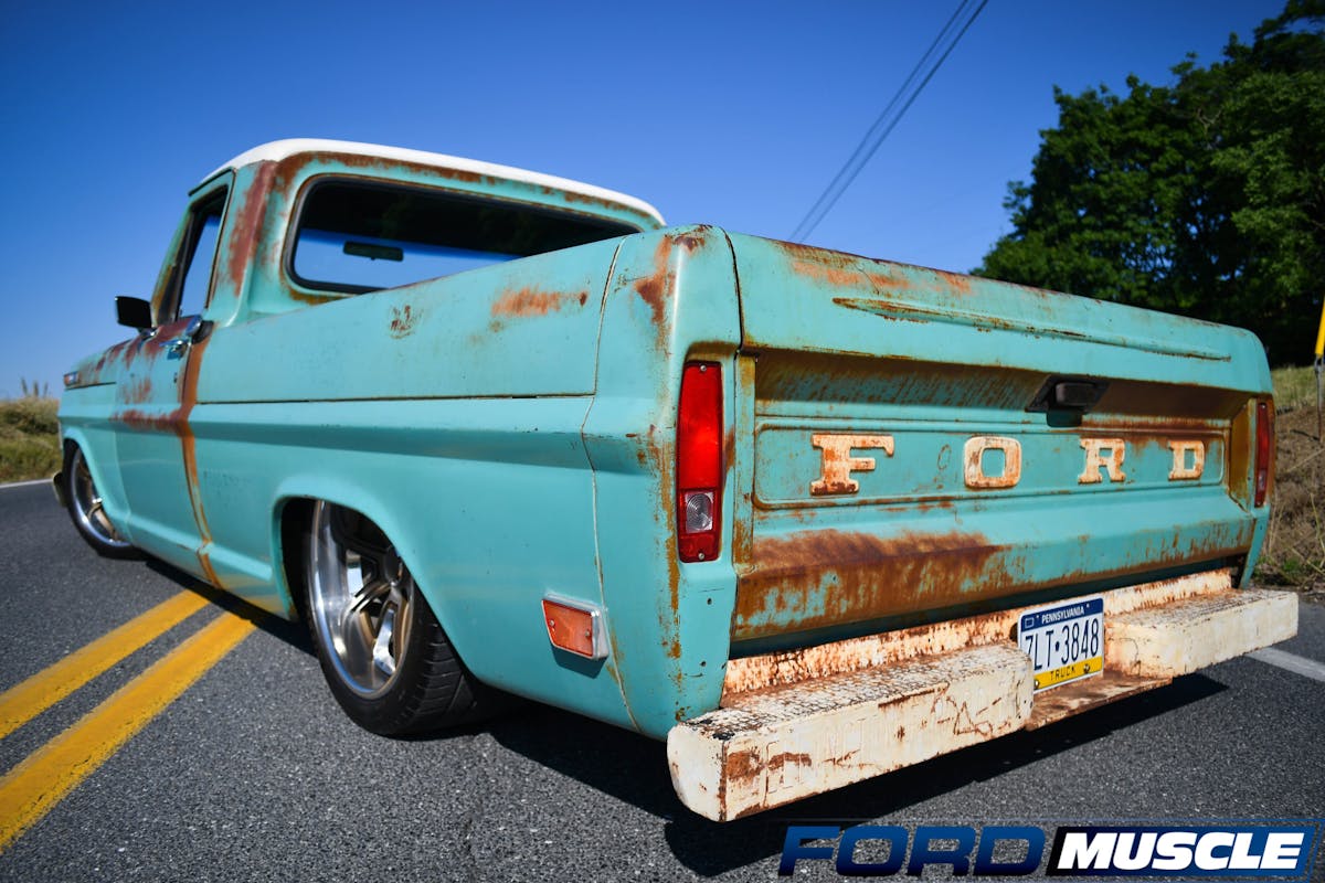 Sands lives in Quakertown, Pennsylvania, and owns a few car dealerships, including two Ford dealerships. About three years ago, Sands was looking for an old Ford truck to tinker on in his home garage. “I figured I would get an F-100, toss in a V8, and probably install a Ford Crown Vic front end,” says Sands. That idea sent him searching the internet to find the perfect starting project. Eventually, he found a 1969 Ford F-100 short-bed Bumpside with a six-cylinder engine and all-original paint on ebay in Missouri. A quick transfer of $5,000 from his bank account and the Ford was his. He brought it home and put it in his garage to begin the process of upgrading the engine and suspension.