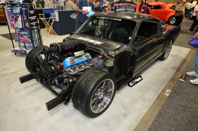 Hollywood Hot Rods went beyond the usual custom paint and bolt-on performance parts, and instead sunk more than 400 hours into a custom built body that looks great and seriously enhances performance. But the real centerpiece is the folding aluminum roof, and under the hood is a supercharged Coyote 5.0 making more than 600 horsepower. It’s an unforgettable ride at an unforgettable show.
