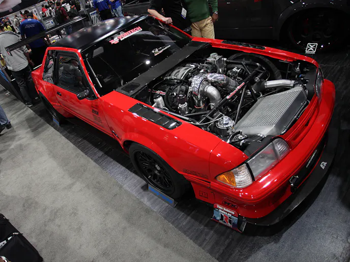 That’s why he also paid special attention to the looks of their notchback Fox-body, adding a ‘93 Cobra front end and carbon fiber flared front fenders and rear quarters that give it that widebody look and function. The Race Red exterior is enhanced by carefully blacked-out bits, and Top Notch looks every bit like the racing Mustangs of yesteryear that surely inspired it.