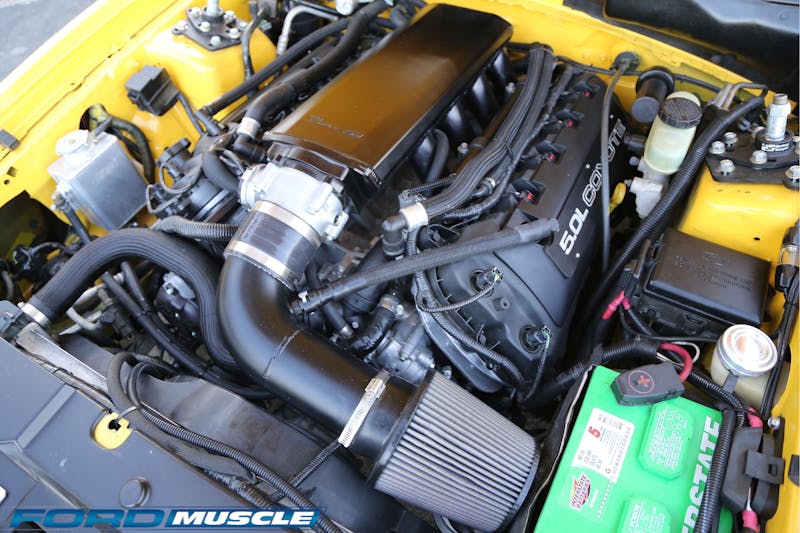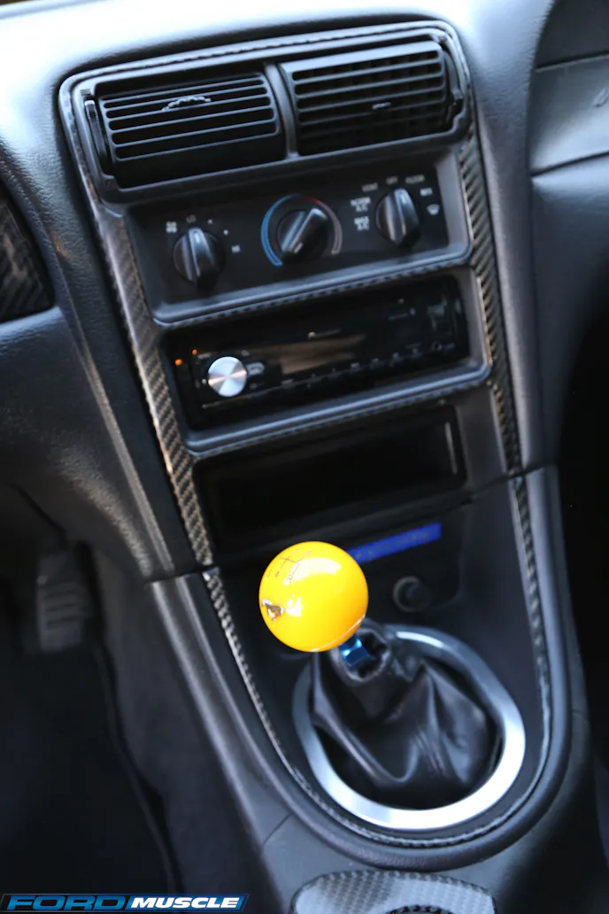 Inside, Denny’s Mustang is largely as delivered. He can drive confidently thanks to the support offered by the SVE Sport seats, while a 200-watt audio system keeps him entertained. That system is highlighted by a Pioneer head unit, a 12-inch MTX subwoofer, and a Kicker amplifier. That yellow shift knob tops a Steeda Tri-Ax shifter which actuates the T-5 five-speed manual.