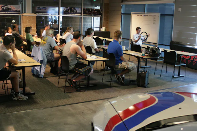 BOSS 302 owners skill levels on the track vary from beginner to advanced. Miller starts the BOSS Track Attack at the basic level and works from there throughout the day as students advance their skills. The course begins with classroom instruction that overviews braking force, apexing, and vehicle dynamics. The classroom instruction is the most important part of the whole experience. Some of the key points include: